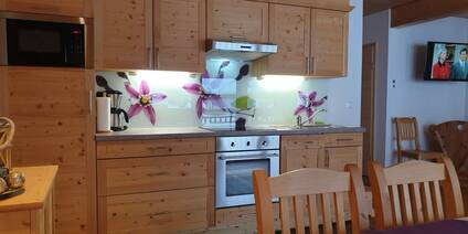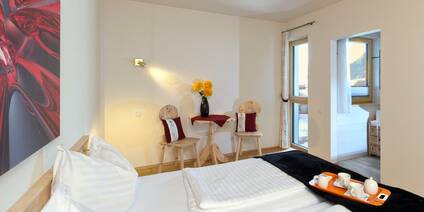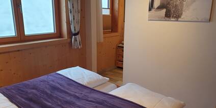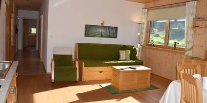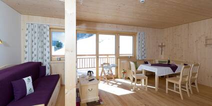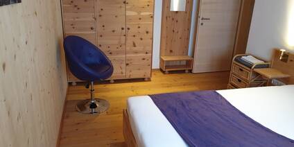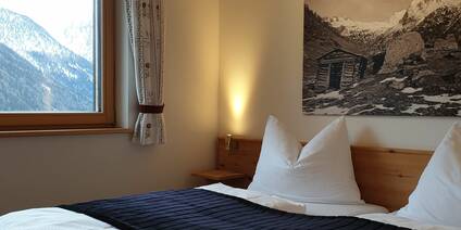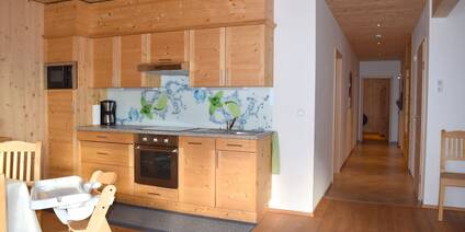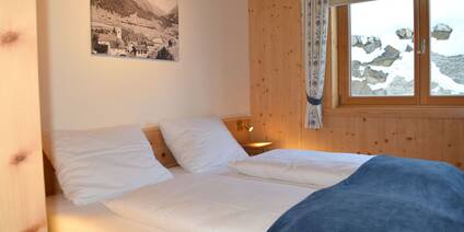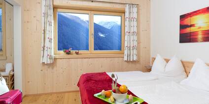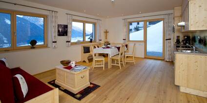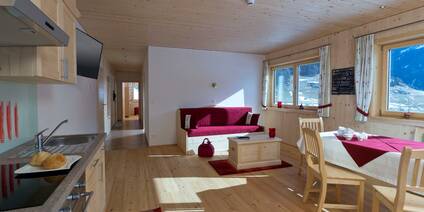 Die modernen Appartements des Hauses bestechen durch helle Holzmöbel und -böden, die eine gemütliche Atmosphäre schaffen. Jedes Appartement verfügt über eine großzügige Sitzecke, ein Gäste-WC und zwei oder drei Schlafzimmer, jeweils mit eigenem Badezimmer. Von jeder Wohnung aus gelangen Sie auf eine private Terrasse, auf der Sie den atemberaubenden Blick auf das Tal und die majestätische Bergwelt genießen können.