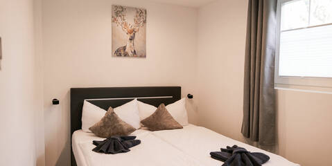 Das Appartement bietet zwei separate Schlafzimmer mit gemütlichen Doppelbetten und damit ausreichend Platz für Paare, Freunde oder Familien. Ein modernes Badezimmer mit Dusche und WC sowie ein offener Wohn- und Essbereich runden die großzügige Raumaufteilung ab.