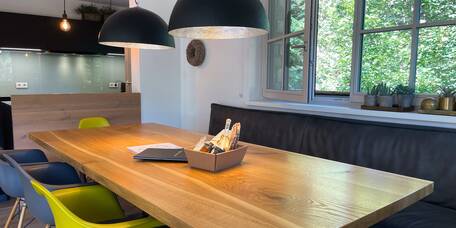 Die Gestaltung der Lodge vereint modernes Design mit alpinem Charme und sorgt für eine gemütliche Wohlfühlatmosphäre. Große, offene Räume, ein knisternder Kamin und eine einladende Lounge schaffen einen perfekten Ort zum Entspannen. Durch die großzügigen Fenster haben die Gäste einen atemberaubenden Blick auf die umliegende Bergwelt. Die voll ausgestattete Küche mit hochwertigen Geräten und viel Platz lädt zum gemeinsamen Kochen ein, während der Essbereich mit einem Massivholztisch und Sitzbank Platz für bis zu zehn Personen bietet – ideal für gesellige Mahlzeiten.