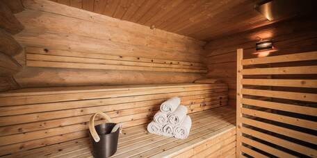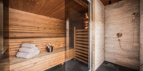 Der Outdoor-Bereich bietet eine private Terrasse mit einem aus heimischen Rundstammhölzern gefertigten Saunahäuschen, in dem Sie sich nach einem aktiven Tag in der Natur wunderbar entspannen können. Liegestühle und eine großzügige Sitzecke laden zum Verweilen und Genießen der frischen Bergluft und der beeindruckenden Aussicht ein.