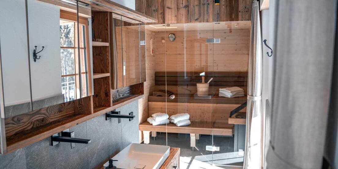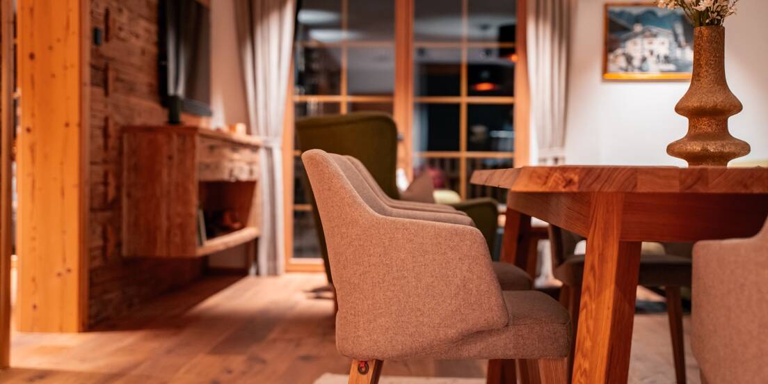 With 110 m² of living space, the Gams Suite offers room for two to six people. Two bedrooms, two modern bathrooms with sauna, and a spacious living area create plenty of room for spending time together. Fine materials, harmonious colors, and loving details give the suite a special quality. The private outdoor wellness area with whirlpool, sauna, and a spacious terrace makes the suite an exclusive oasis.