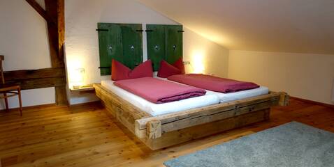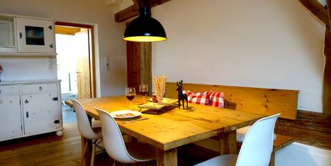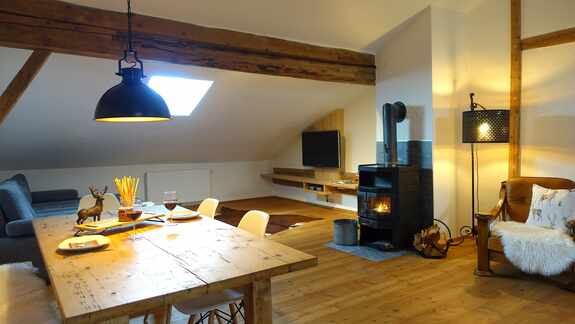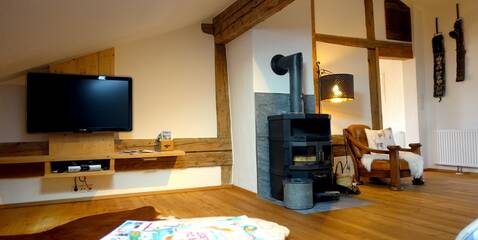The apartment welcomes its guests with a spacious living room, which radiates a particularly cozy atmosphere thanks to the rustic exposed wood and the warming wood-burning stove. The wood-burning stove provides cozy warmth and accompanies guests throughout the apartment with its pleasant crackling.